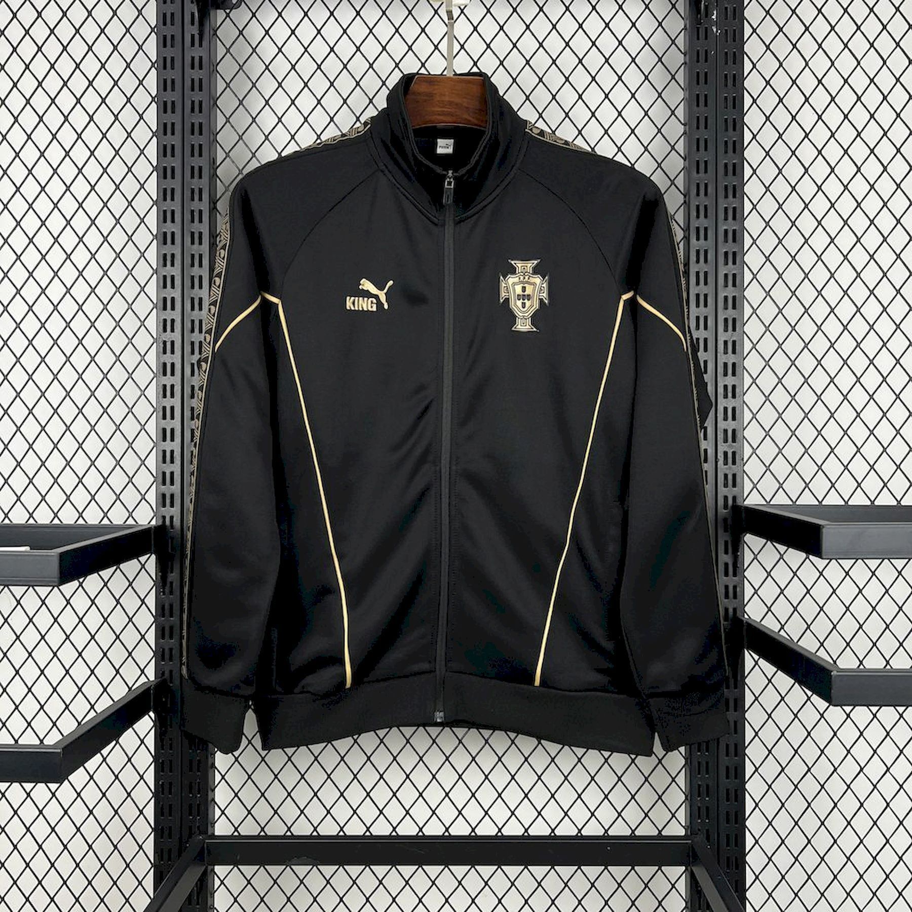El Conjunto Chandal Portugal 2026 Eusebio edición especial ha sido diseñado para rendir tributo a la Pantera Negra con una estética elegante y poderosa. Tanto la chaqueta como el pantalón presentan un color negro profundo, símbolo de autoridad y respeto, mientras que el escudo y el logo en color dorado evocan la grandeza y el legado eterno de Eusébio.